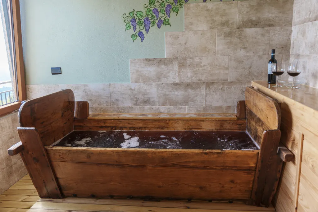 Concedetevi il piacere di immergervi in un bagno di vino rosso dei produttori locali per il benessere della vostra pelle e della vostra mente.